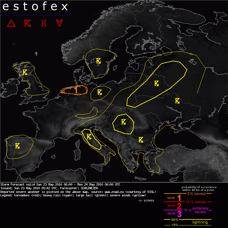A level 1 was issued for the Netherlands and NW Germany mainly for severe wind gusts and to a lesser extent for tornadoes.Valid: Sun 23 May 2010 06:00 to Mon 24 May 2010 06:00 UTC