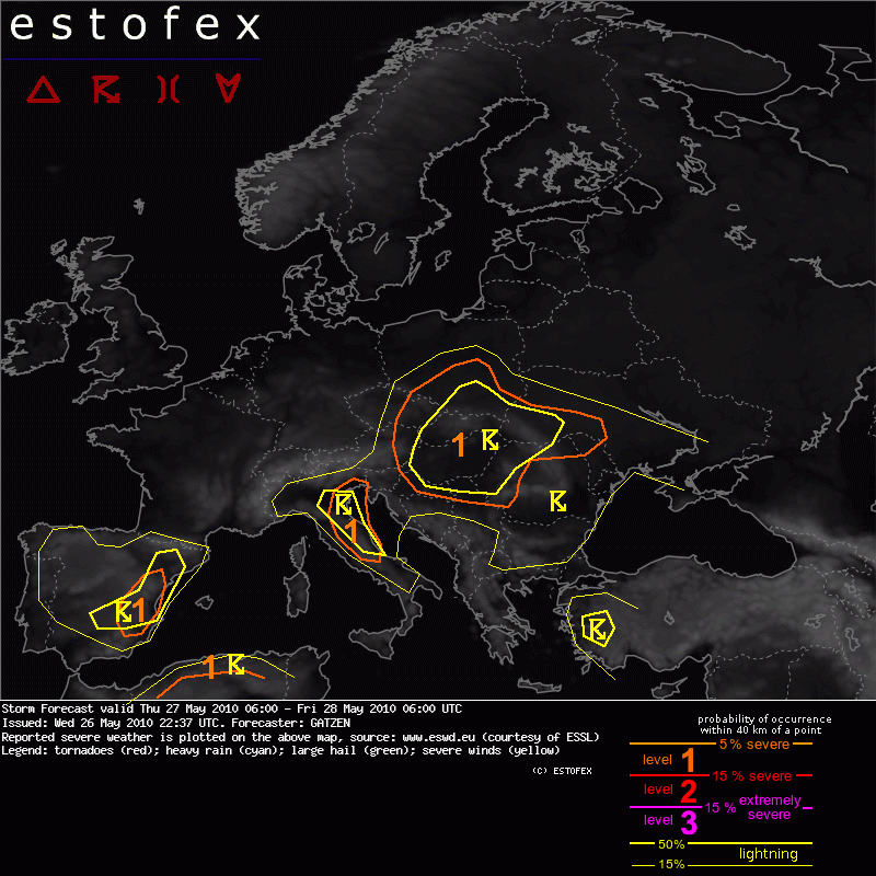 A level 1 was issued for central Italy mainly for large hail and tornadoes.Valid: Thu 27 May 2010 06:00 to Fri 28 May 2010 06:00 UTC